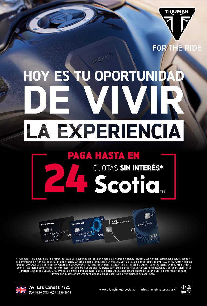 Promoción válida hasta el 31 de julio de 2024 para compras en hasta 24 cuotas sin interés en Tienda Triumph, Las Condes, cargándose solo la comisión de administración mensual de la Tarjeta de Crédito. Cuotas afectas al impuesto de timbres DL3475, el cual es de cargo del cliente. CAE 1,47%. Costo total del crédito: $604.752. Calculados por un monto de $600.000 en 24 cuotas, según cupo disponible de la Tarjeta de Crédito. La transacción en el punto de venta podría visualizarse como "venta con intereses", sin embargo, al procesar la transacción en el banco, esta se ejecutará sin intereses y así se reflejará en el próximo estado de cuenta. Exclusiva para clientes personas naturales de Scotiabank que utilicen su Tarjeta de Crédito Scotia como medio de pago. Promoción cuotas sin interés condicionada al pago oportuno al vencimiento de cada cuota.